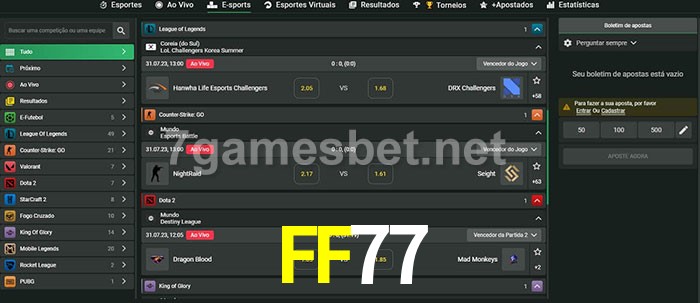 O FF77 oferece uma grande seleção de opções de apostas em e-sports com probabilidades competitivas
